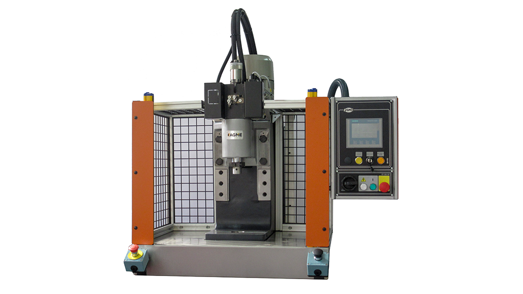 AGME manufactures two models of desktop hydraulic presses: PHM-5 TG and PHM-10 TG for performing forces from 5 to 10 tons, respectively. Both models have TG butts to adjust with accuracy the stroke advance. These desktop presses also have guards and photoelectric barriers in order to guarantee the operator safety.